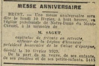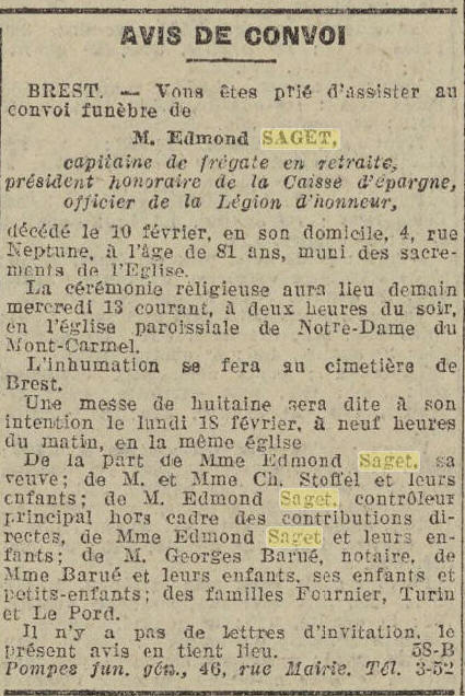 BREST (Finistère) - Décédé le 10 février 1929 à BREST