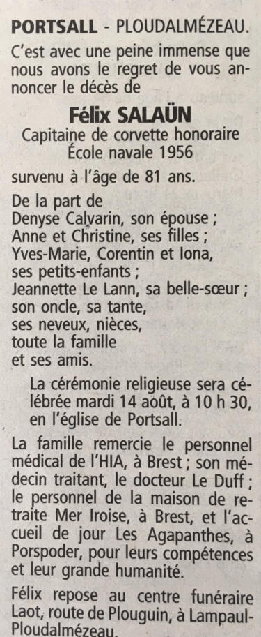 Obsèques en l'église de Porsall (Finistère) le 14 août 2018