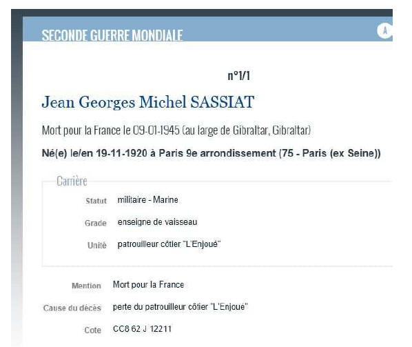 à PARIS IXe (Seine) - Décédé le 9 janvier 1945 au large de GIBRALTAR