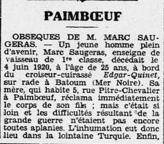 Décédé le 4 juin 1920, à bord du "EDAR-QUINET" sur rade à BATOUM