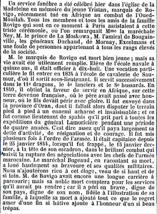 Le décès de Tristan de Rovigo est signalé en ces termes dans le