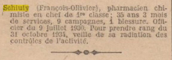 Pharmacien chimiste en chef de 1ère classe le 31 mai 1929.