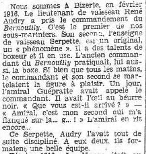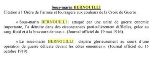 sous-marin "BERNOULLI" (Cdt Jules AUDRY), il est cité à l'ordre de
