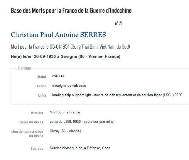 1955, l'enseigne de vaisseau Serres a reçu à titre posthume la