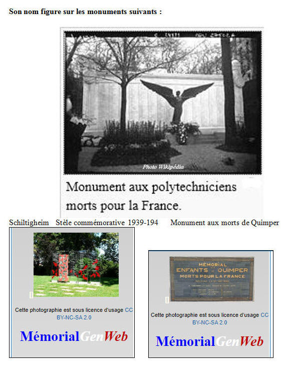 Son nom figure sur le monument aux morts de Quimper (Finistère), sur