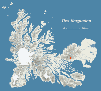 Kerguelen par Edgar Aubert de la Rüe, géologue, en 1952 (point rouge