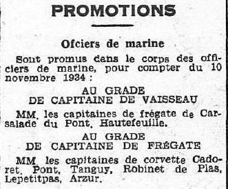 Enseigne de Vaisseau de 1ère classe le 7 novembre 1916.