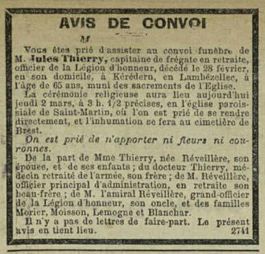BREST (Finistère) - Décédé le 28 février 1905 à LAMBÉZELLEC