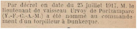commande le torpilleur N° 322 à DUNKERQUE.Il se distingue lors des