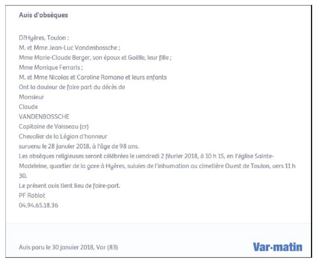 Obsèques le vendredi 2 février à l'église Sainte Madeleine de HYERES