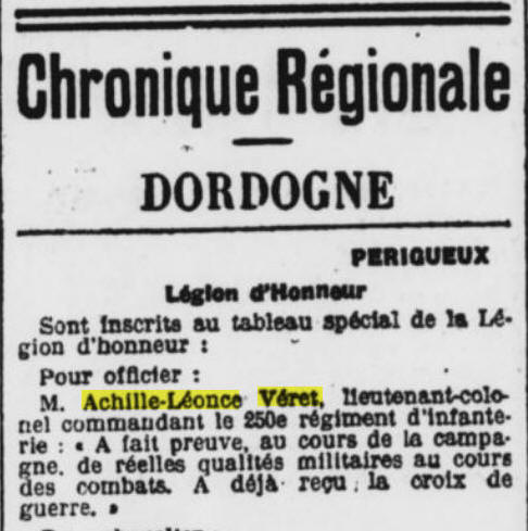 Officier de la Légion d'Honneur le 11 janvier 1916, étant