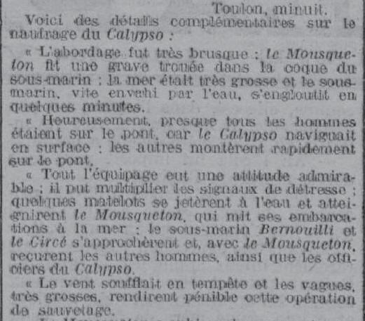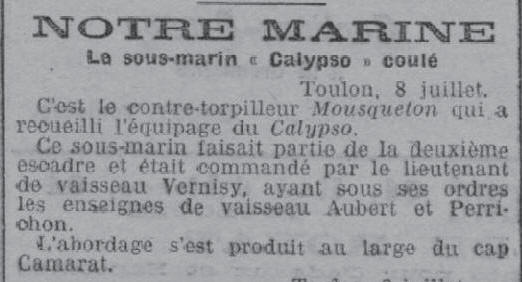 Commandant le sous-marin "CALYPSO", affecté au 1er janvier 1914 à la