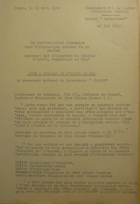 sous-marin Protée a reçu la citation suivante à l'ordre de l'Armée :