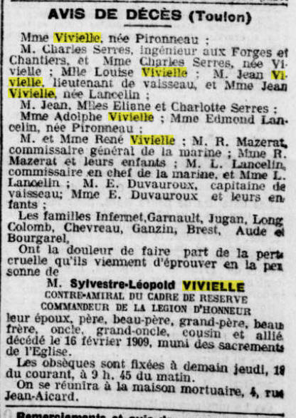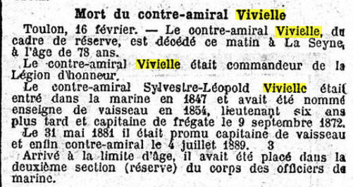 ROCHELLE (Charente Maritime) - Décédé le 16 février 1909 à TOULON