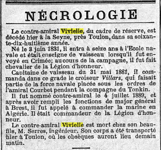 d'Honneur le 23 juillet 1879, étant sur le cuirassé "PROVENCE" En 1881, Second à bord