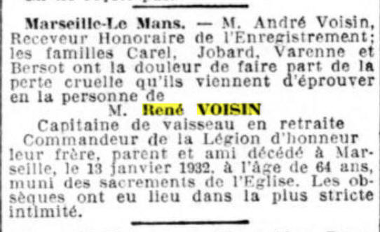 (Sarthe) - Décédé le 13 janvier 1932 à MARSEILLE (Bouches du Rhône)