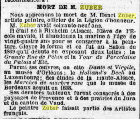 C'est en 1909 que Jean-Henri Zuber décède après une intervention