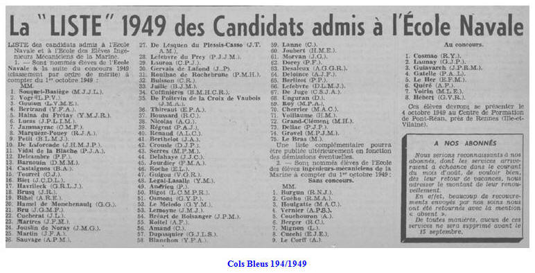 Liste Promotion / Extrait Cols bleus du 26 aout 1949